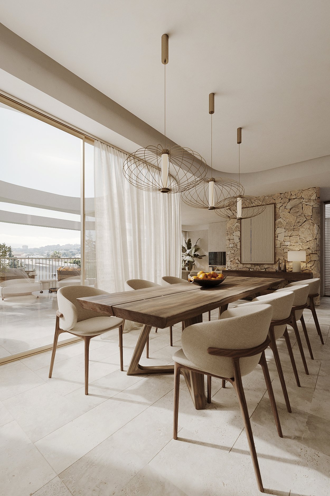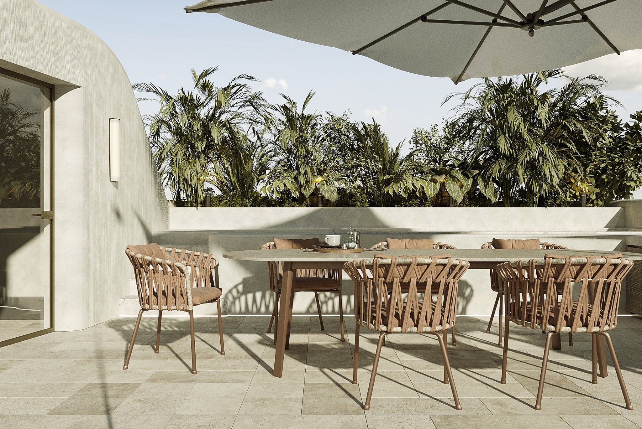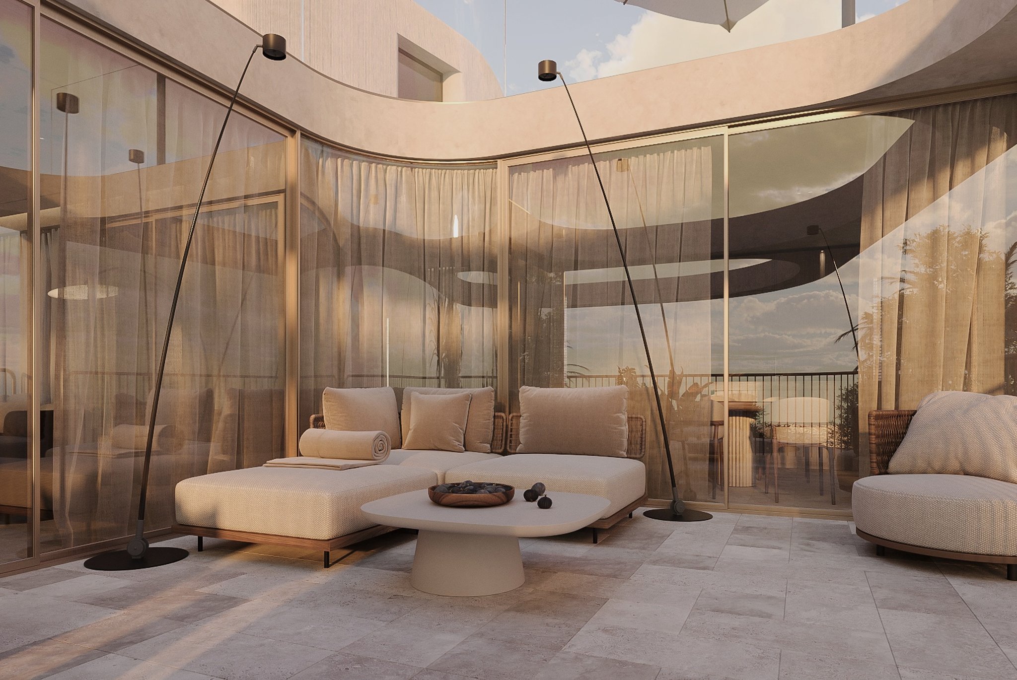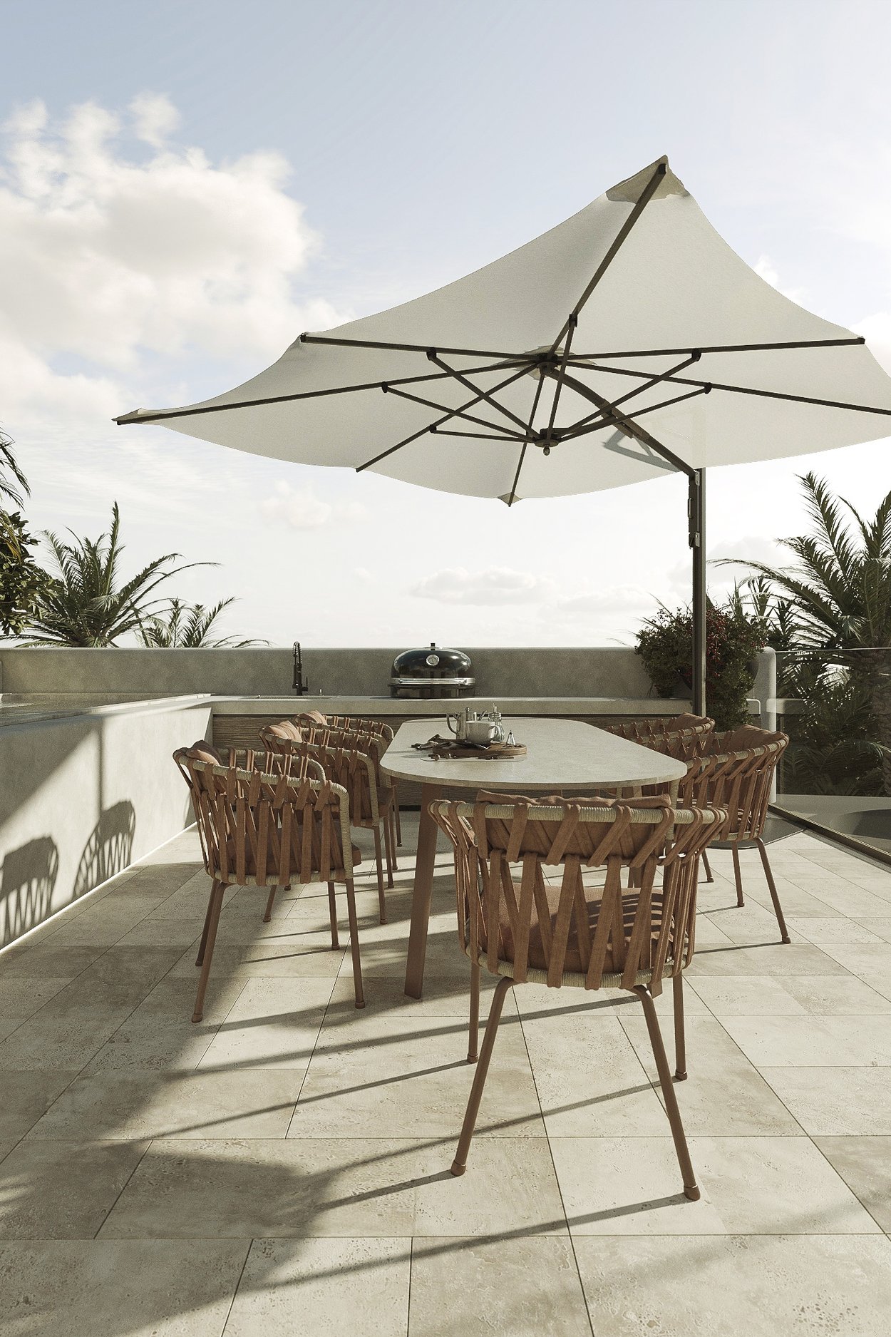 Denne lejlighed ligger på øverste etage og tilbyder et boligareal på 212 kvadratmeter, fordelt på tre generøse soveværelser og tre moderne badeværelser. Lejligheden har en åben planløsning, hvor det luksuriøse køkken er integreret med den smukke stue og spisestue. Lejligheden har også en privat balkon på 19 kvadratmeter og en privat tagterrasse på 68 kvadratmeter med betagende udsigt. Ejendommen er af høj kvalitet overalt med naturlige materialer som træ og sten. Store vinduer, skydedøre fra gulv til loft og tynde aluminiumsprofiler skaber en perfekt overgang mellem inde og ude.