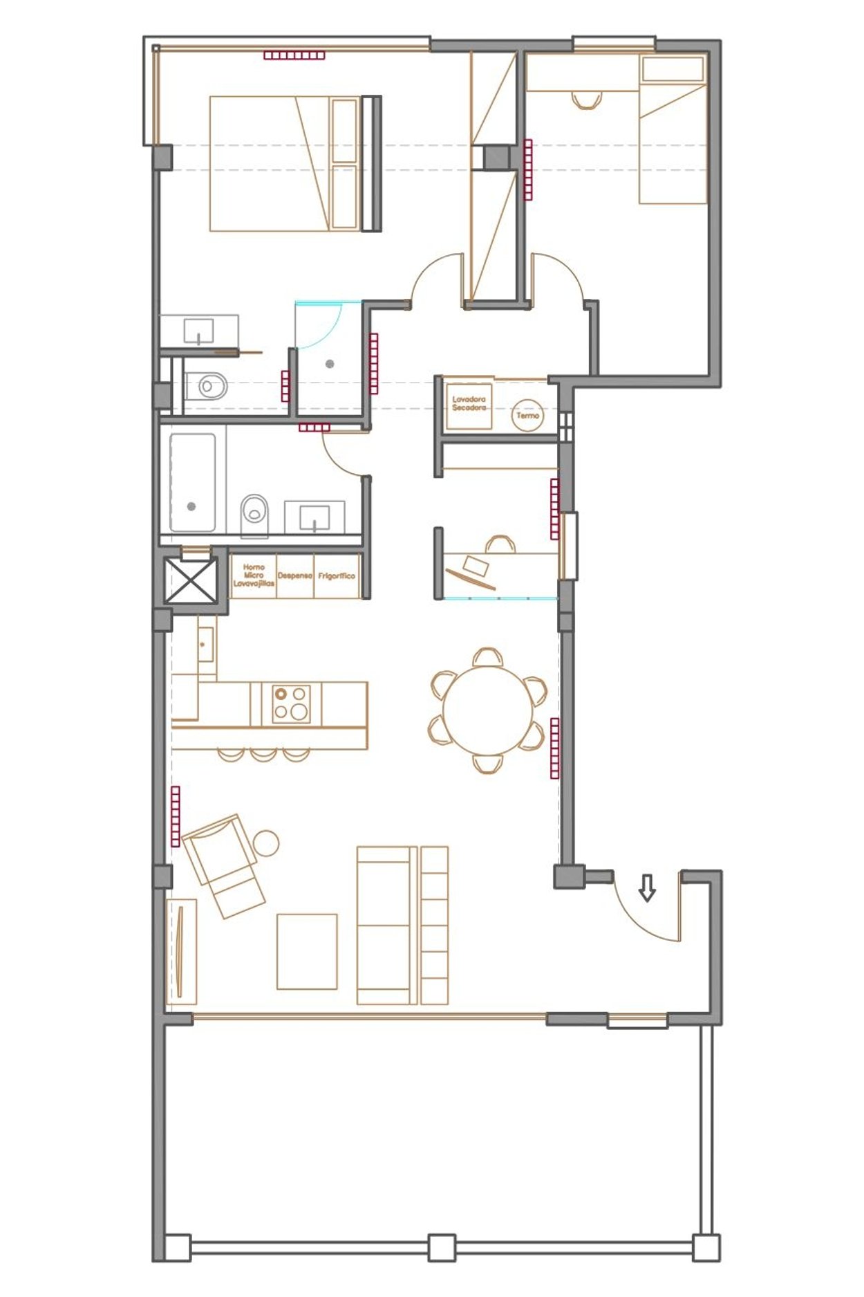 Med 80 m² boligareal har lejligheden en moderne og åben planløsning. Store glasdøre fører fra køkken og stue i åbent plan til en 20 m² stor privat terrasse, som lukker masser af naturligt lys ind og skaber en problemfri overgang mellem indendørs og udendørs rum. Lejligheden har to rummelige soveværelser og to badeværelser. Derudover er der et lille værelse ved siden af stuen, der i dag bruges som kontor. Interiøret kombinerer materialer som mørkt stål og sten, hvilket giver det en moderne og alligevel varm følelse.