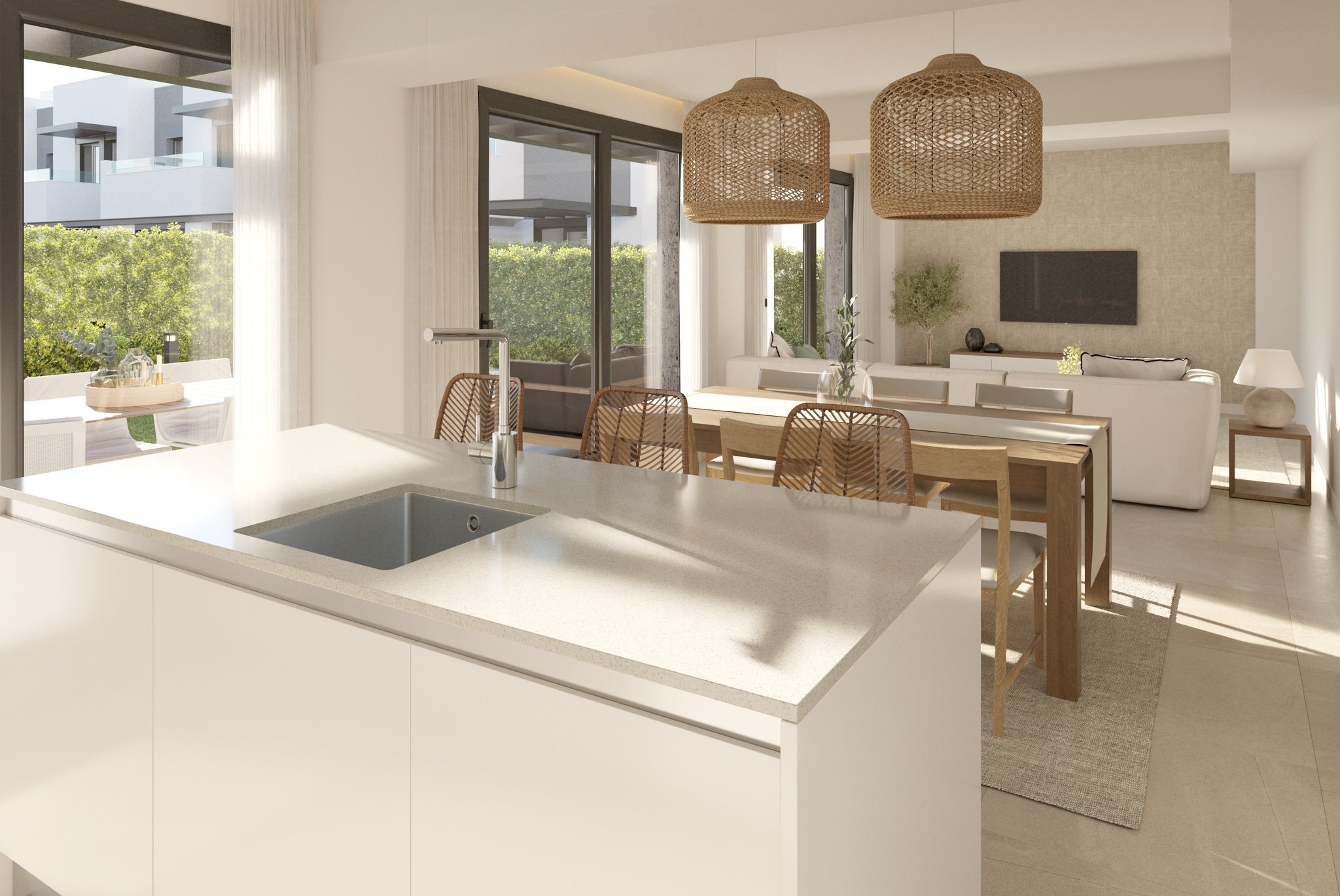 Denne rækkehus har et boligareal på 124 kvm fordelt på to etager samt en dejlig tagterrasse. Ejendommen tilbyder fire rummelige soveværelser, tre badeværelser (hvoraf ét er en-suite), et fuldt udstyret køkken med åben planløsning samt et lyst og luftigt opholdsstue med lounge og spisestue. Det store soveværelse har eget walk-in closet. Den smukke have er 130 kvadratmeter stor og har en indbydende pool. Ejendommen kombinerer moderne og luksuriøs design med åbne rum og moderne funktioner, samtidig med at den store mængde naturligt lys skaber en lys og luftig atmosfære i hele boligen.