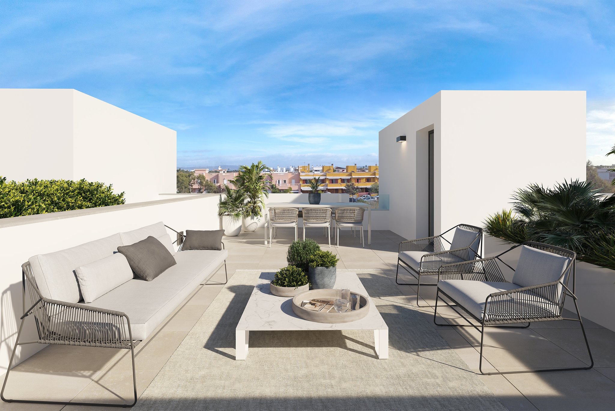 Dette nye projekt ligger i Playa de Palma, langs Palmas strandpromenade. Herfra er der kun 15 minutter til Palmas centrum og kun få minutter til lufthavnen. Oplev luksusen ved en nybygget ejendom med privat pool, tagterrasse og have, alt sammen inden for gåafstand til stranden.