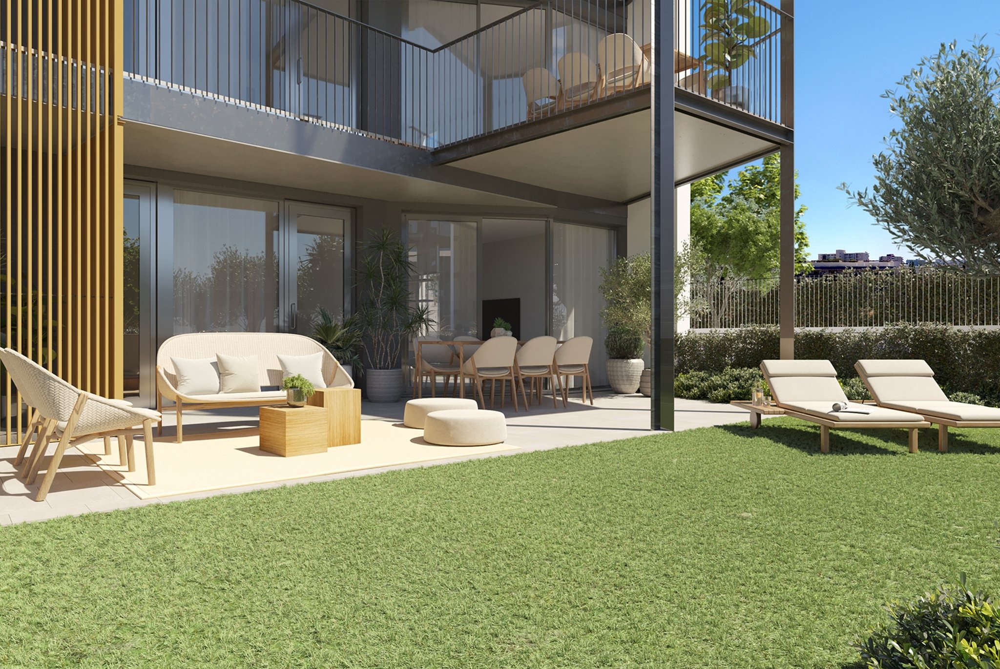 Boligerne er designet til at være åbne udadtil med store vinduespartier, der slipper masser af lys ind og skaber en unik atmosfære. Lejlighedskomplekset har desuden to pools, en saltvandspool for voksne og en for børn, samt et fitnesscenter og andre fællesarealer.