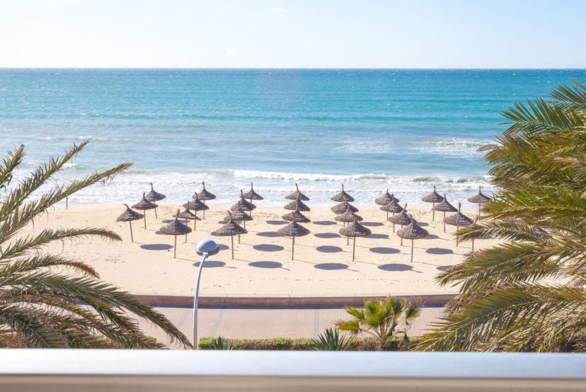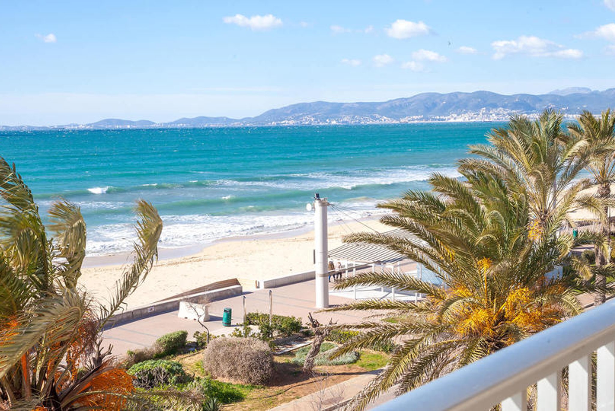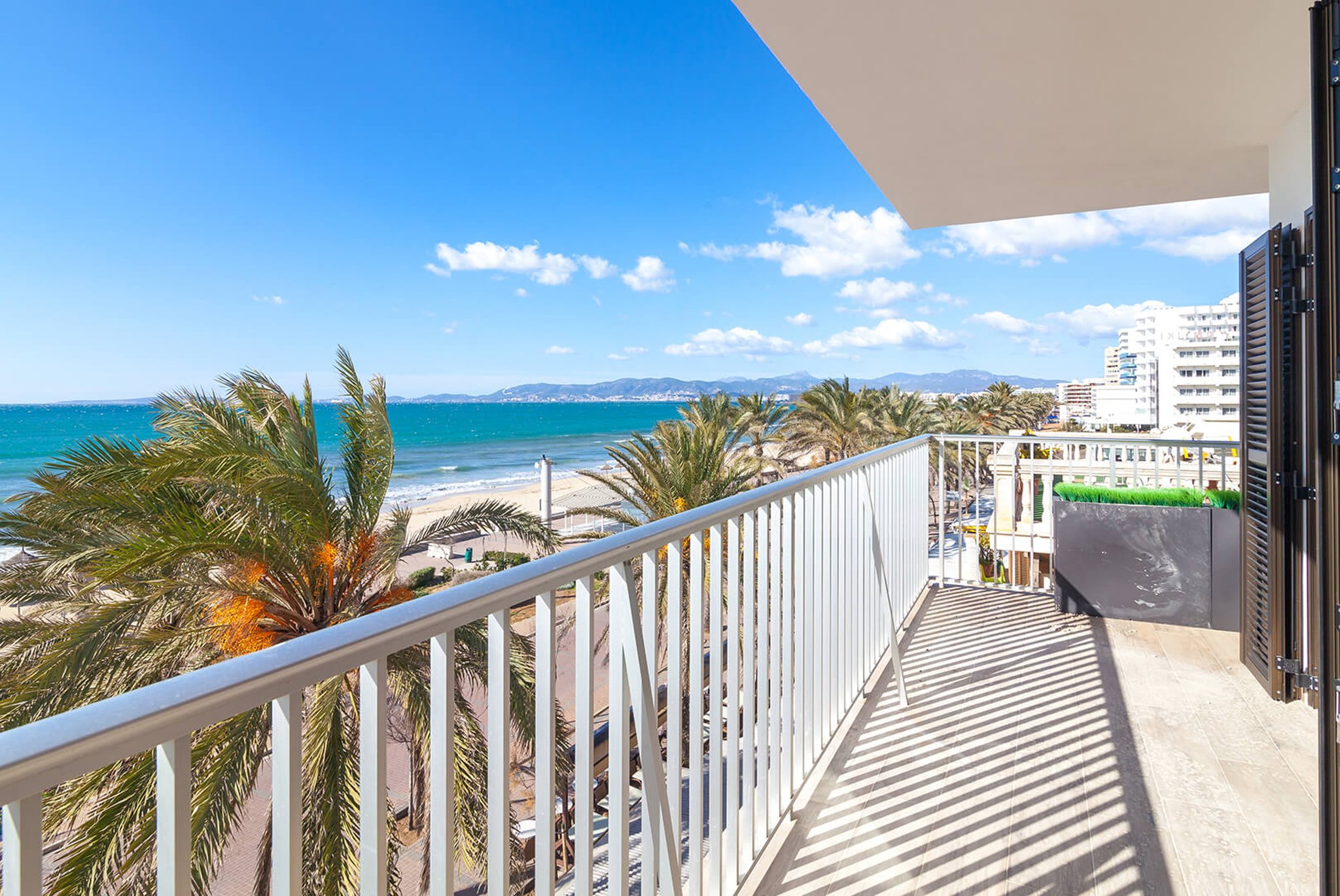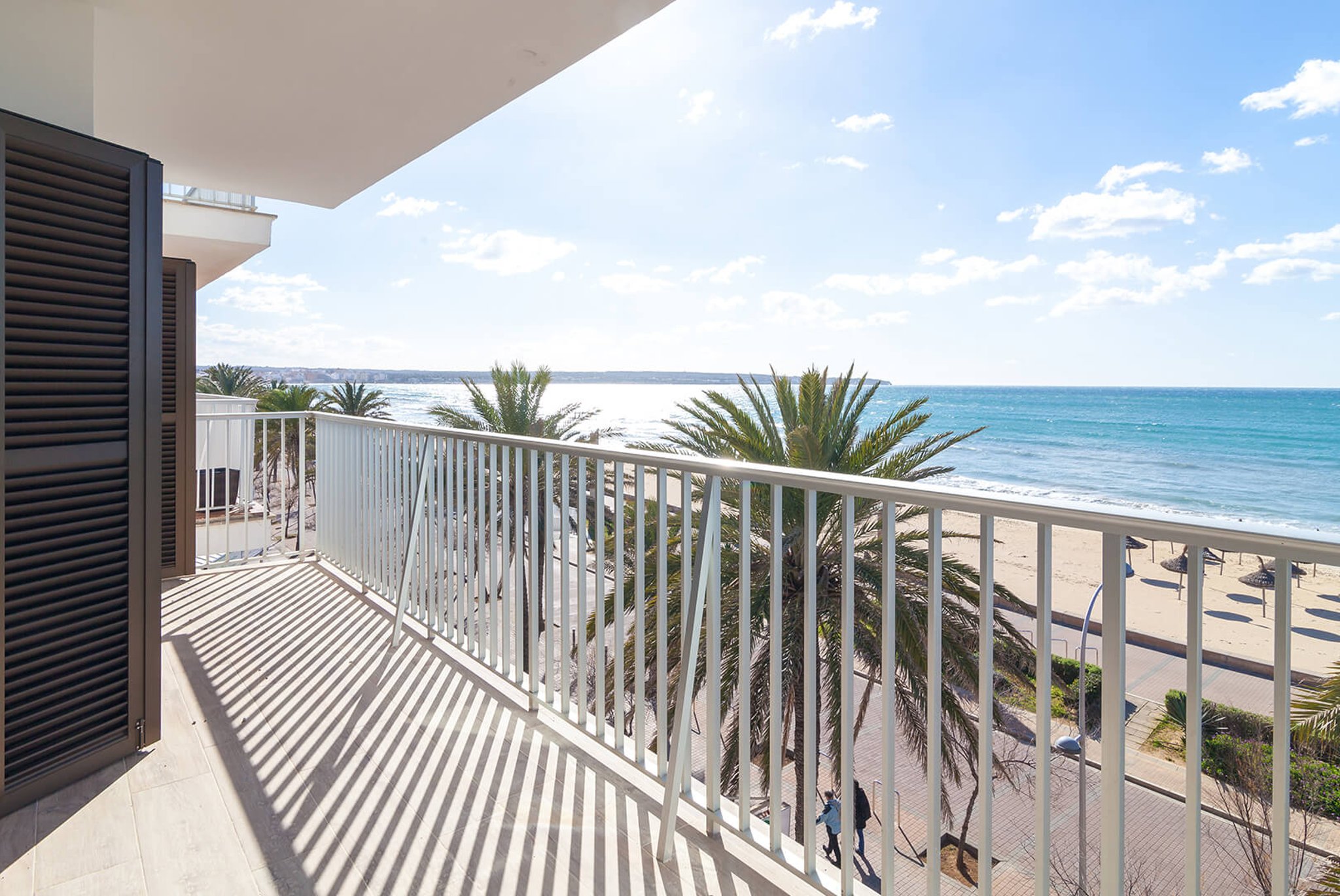 This is a newly renovated modern apartment in top condition, located on the first line and on the promenade of Playa de Palma. It has a living space of 90m2 which is divided into 3 bedrooms, 2 bathrooms of which one en-suite, a large airy living room with open floor plan, where both kitchen and dining area can be accommodated, and a large lovely covered terrace with sea views. The apartment has large panoramic windows that let in a lot of natural light and therefore also gives it a feeling of large airy surfaces. The terrace is 15 m2 and has a fantastic view of the bay of Palma. Interior design and lighting are of high quality with a modern design. Palma city center is only 15 min by car and the airport barely 10 min.