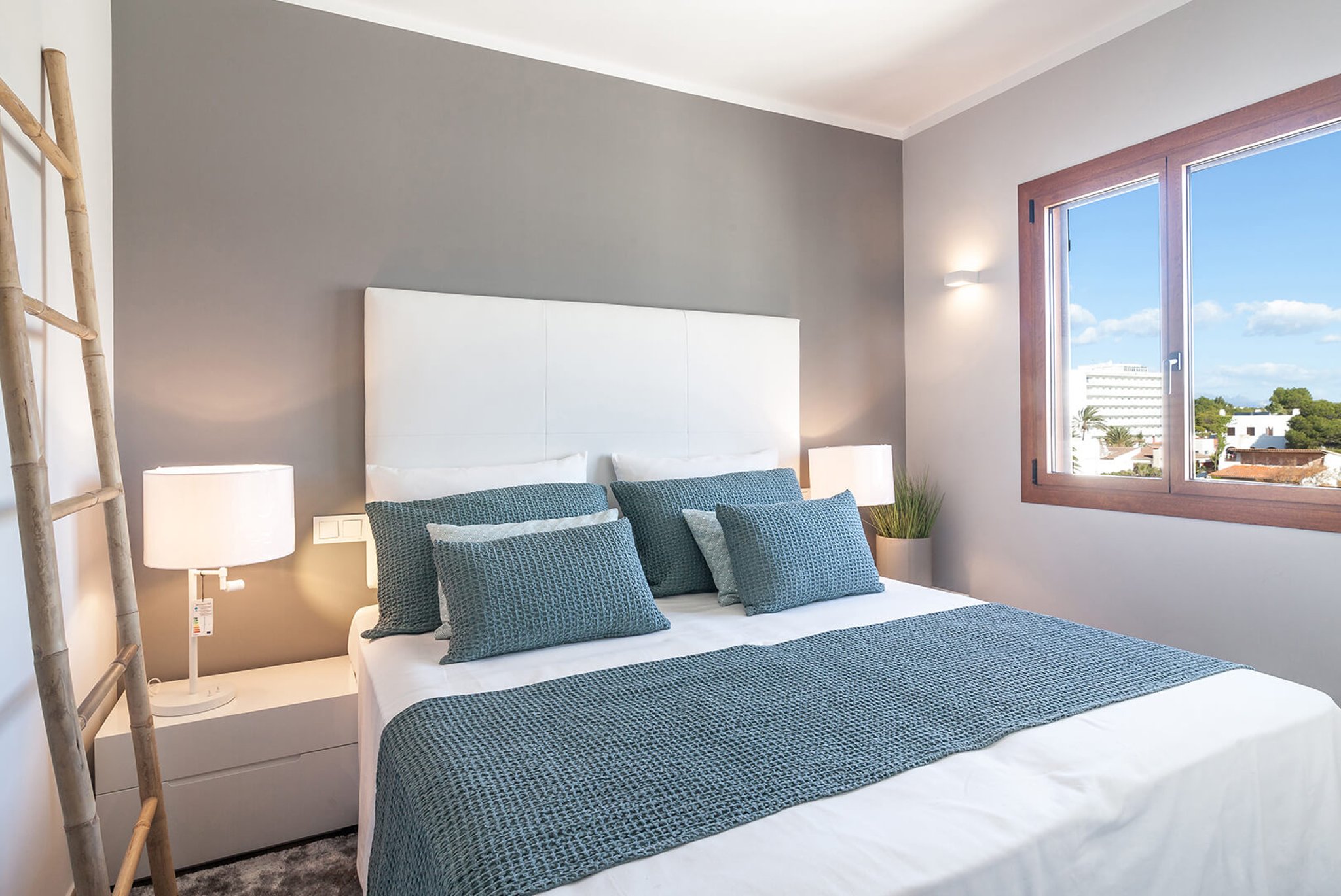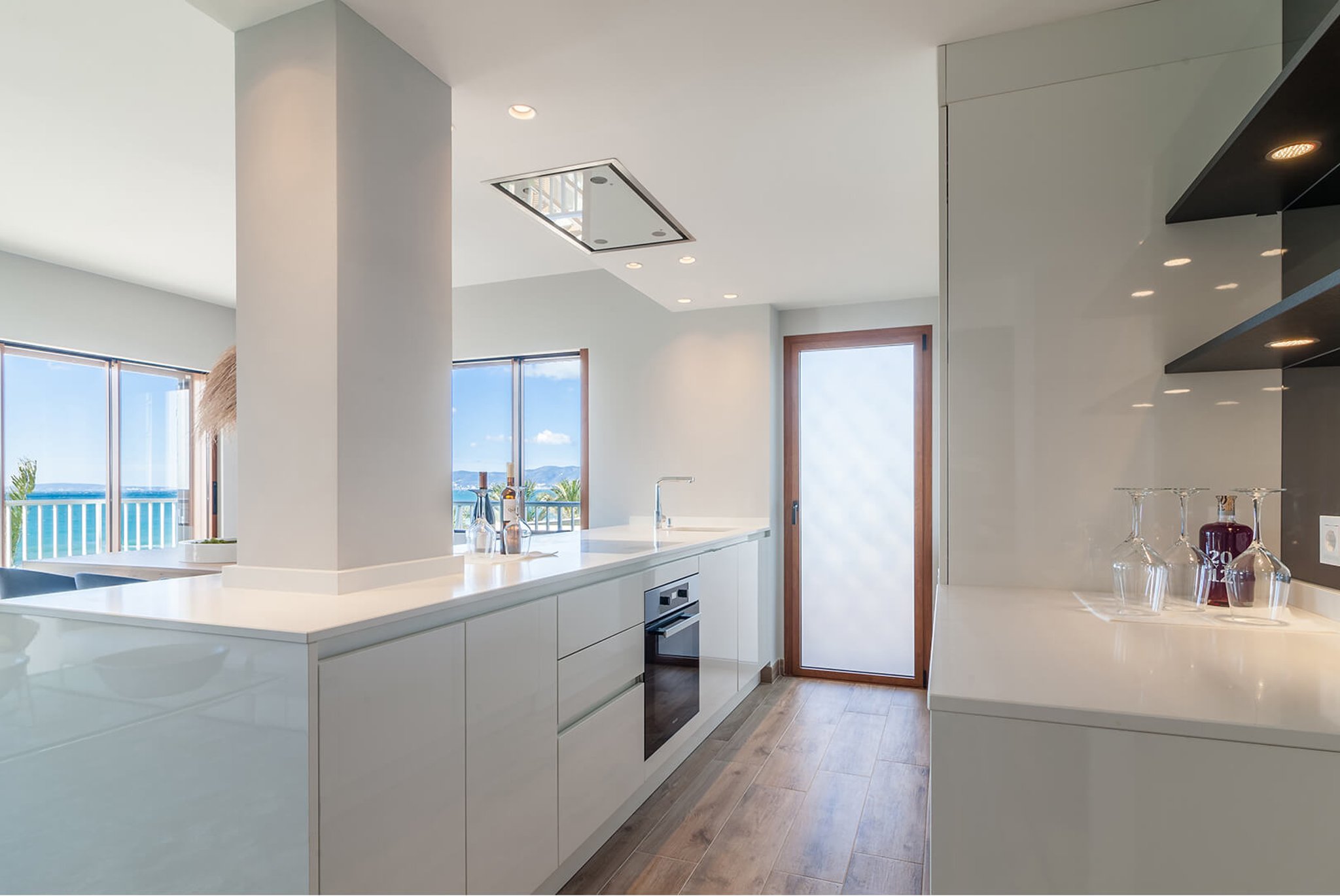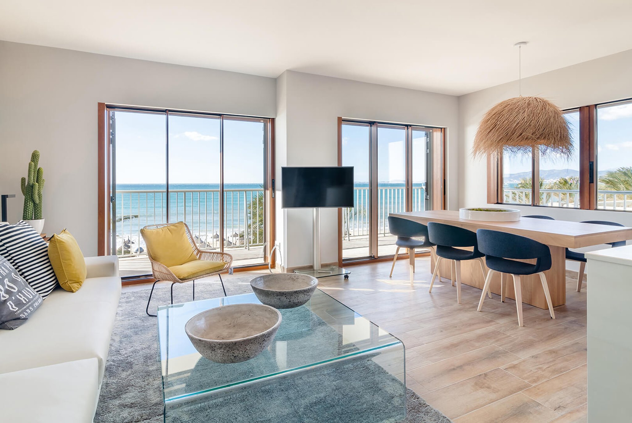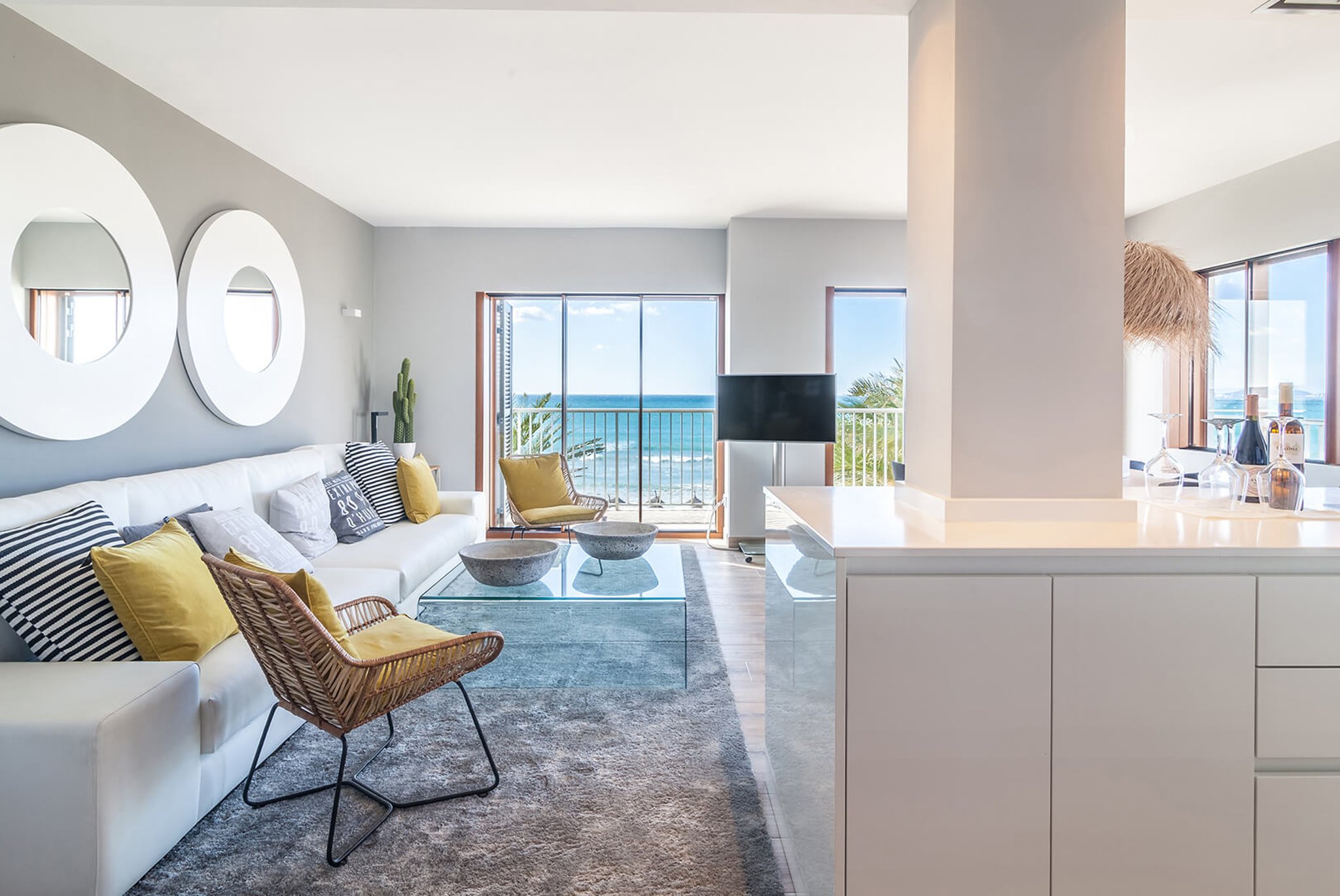 This is a newly renovated modern apartment in top condition, located on the first line and on the promenade of Playa de Palma. It has a living space of 90m2 which is divided into 3 bedrooms, 2 bathrooms of which one en-suite, a large airy living room with open floor plan, where both kitchen and dining area can be accommodated, and a large lovely covered terrace with sea views. The apartment has large panoramic windows that let in a lot of natural light and therefore also gives it a feeling of large airy surfaces. The terrace is 15 m2 and has a fantastic view of the bay of Palma. Interior design and lighting are of high quality with a modern design. Palma city center is only 15 min by car and the airport barely 10 min.
